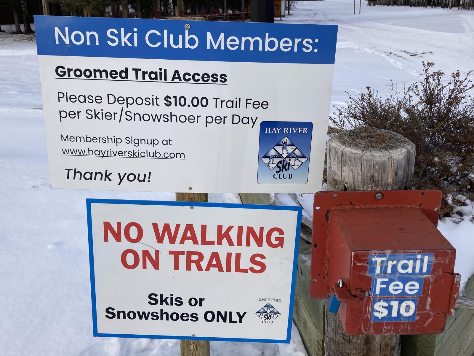 Non-members are welcome to use our trails! The daily non-member trail fee is $10 per person for access to the regular ski trail system and $5 per person for access to the Dog Trail. Fees can be paid in the drop boxes by the trail entrances. These non-member trail fees help offset the cost of maintaining and grooming the trails! Trail maps can be printed off on our website (click on the 'Trails' tab). Following the tracks and signage at the junctions will ensure you won't get lost. Day users ski at their own risk.